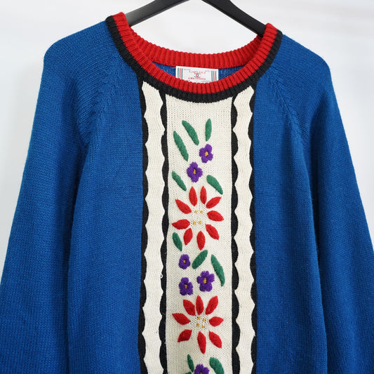 (L) Vintage Capucci 90s Knit Floral Sweater Men's L Blue Flower Embroidered Cottage