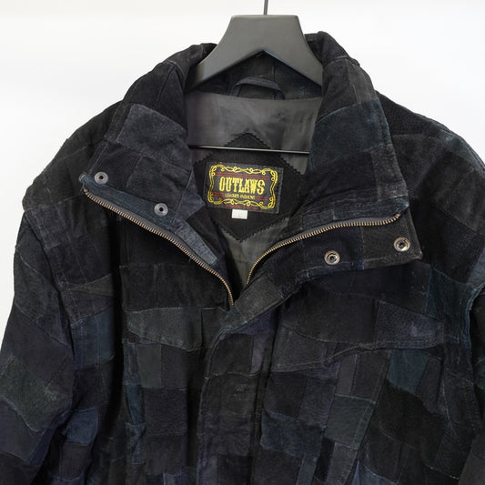 (L) Vintage Outlaw Leathers Patchwork Black Suede Biker Bomber Jacket Men's L 90s