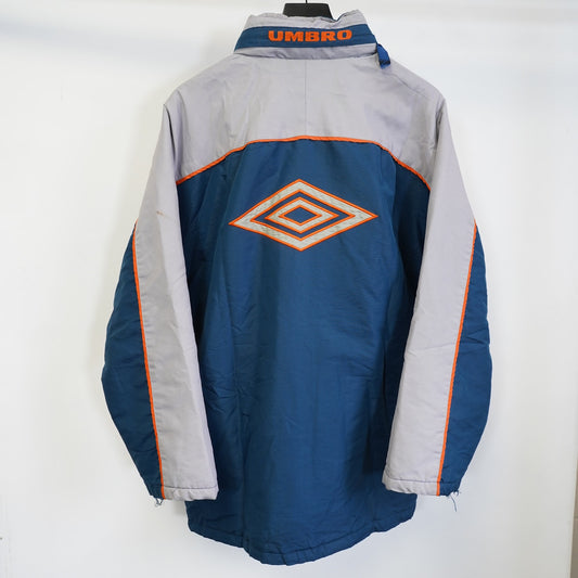 (M) Vintage Umbro Soccer Bench Puffer Jacket Men's M Gray Blue 90s Retro Sewn