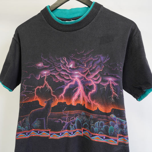 (S) Vintage 90s Habitat Arizona Lightning Wolf AOP Western T-shirt Men's S Black