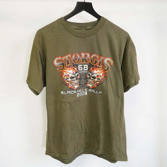 (M) Vintage Stugis 2000s Motorcycle Rally Skull Biker T-Shirt Mens M Olive Green Y2K