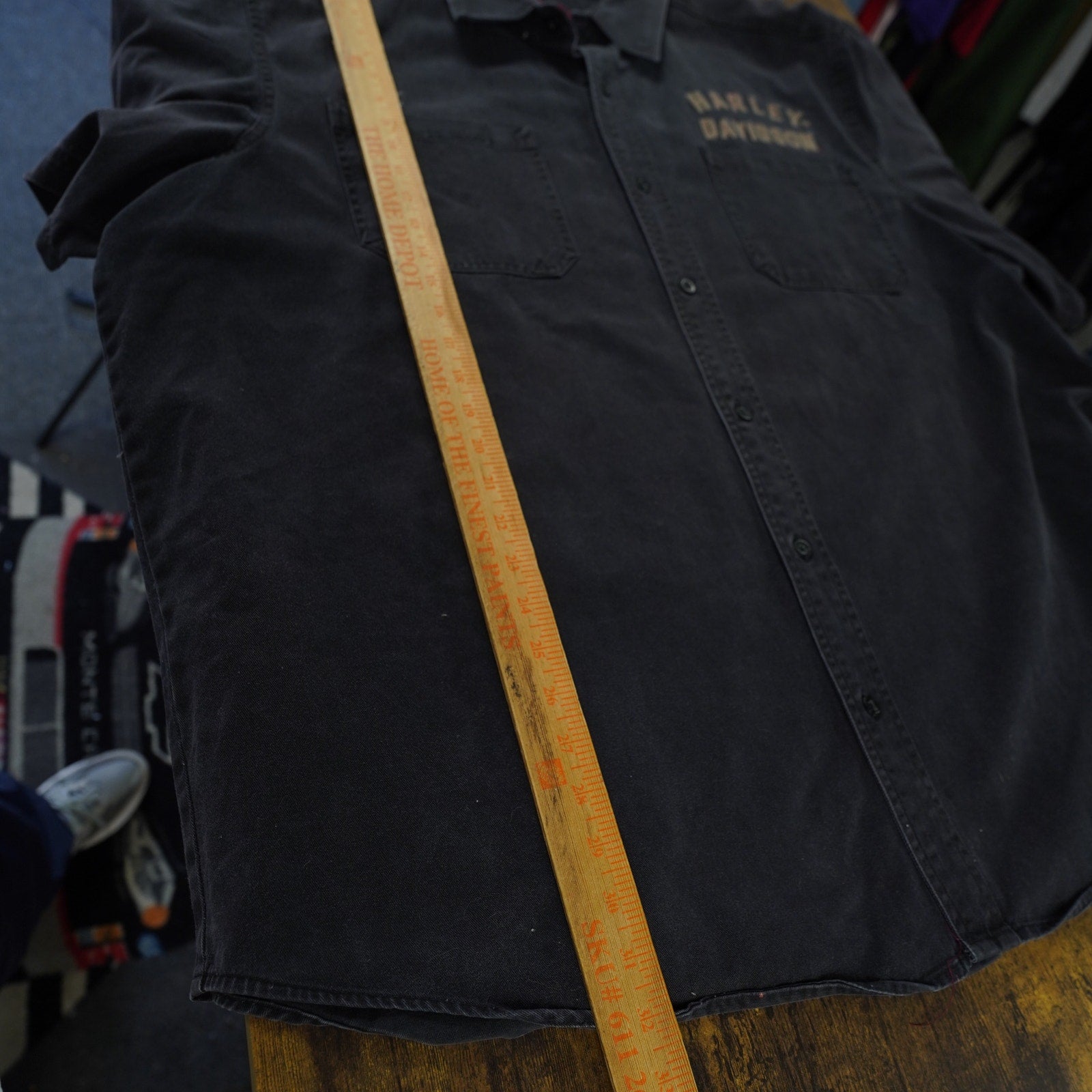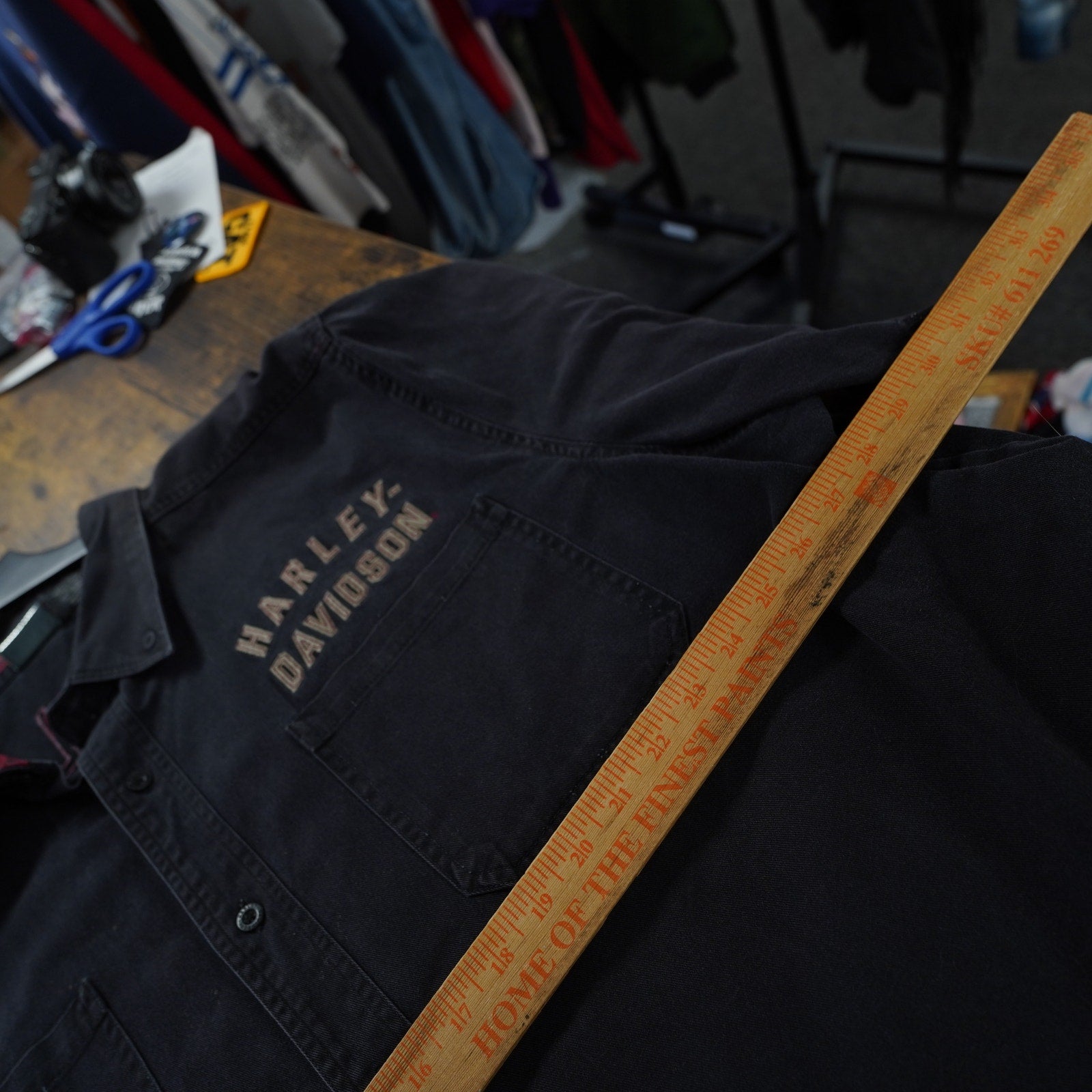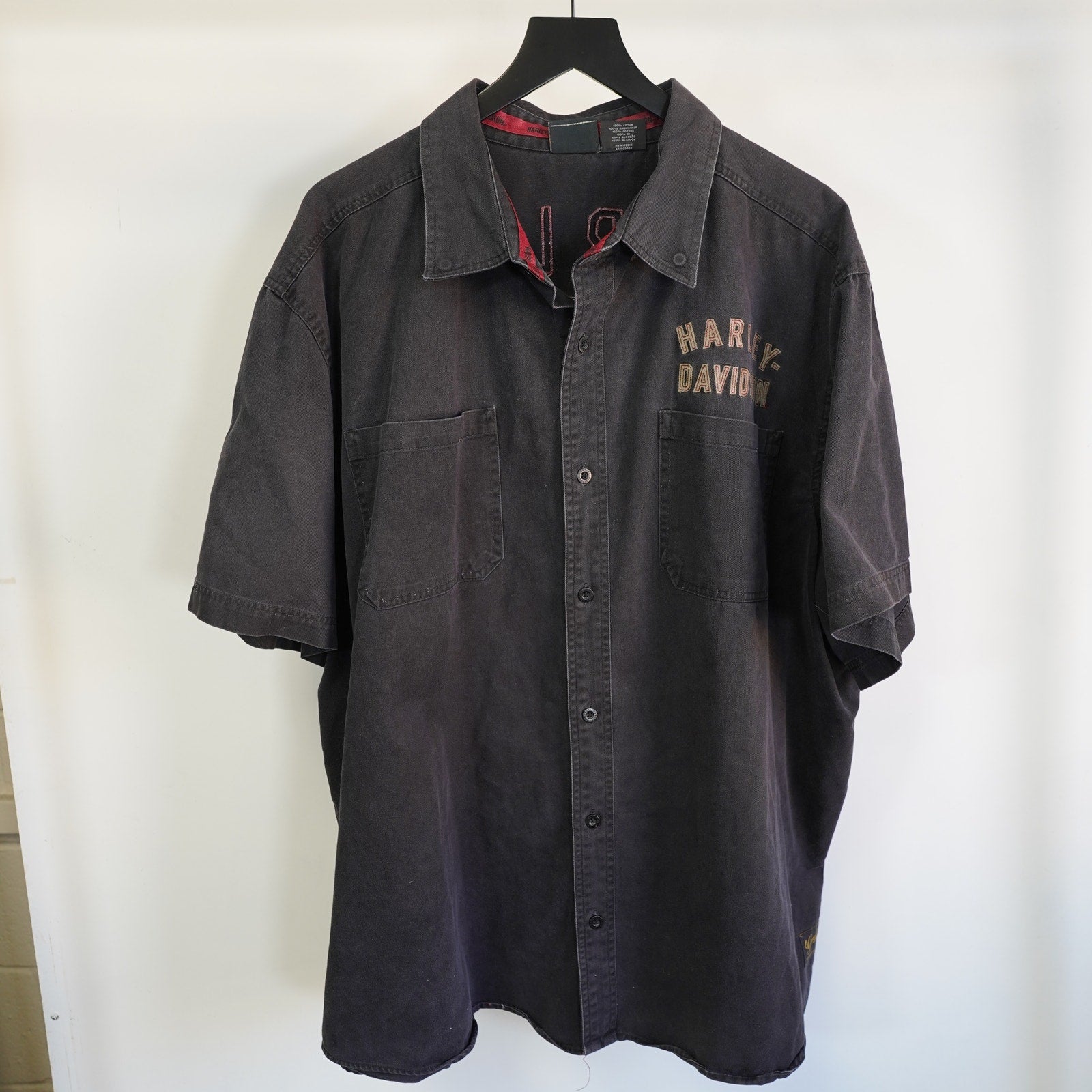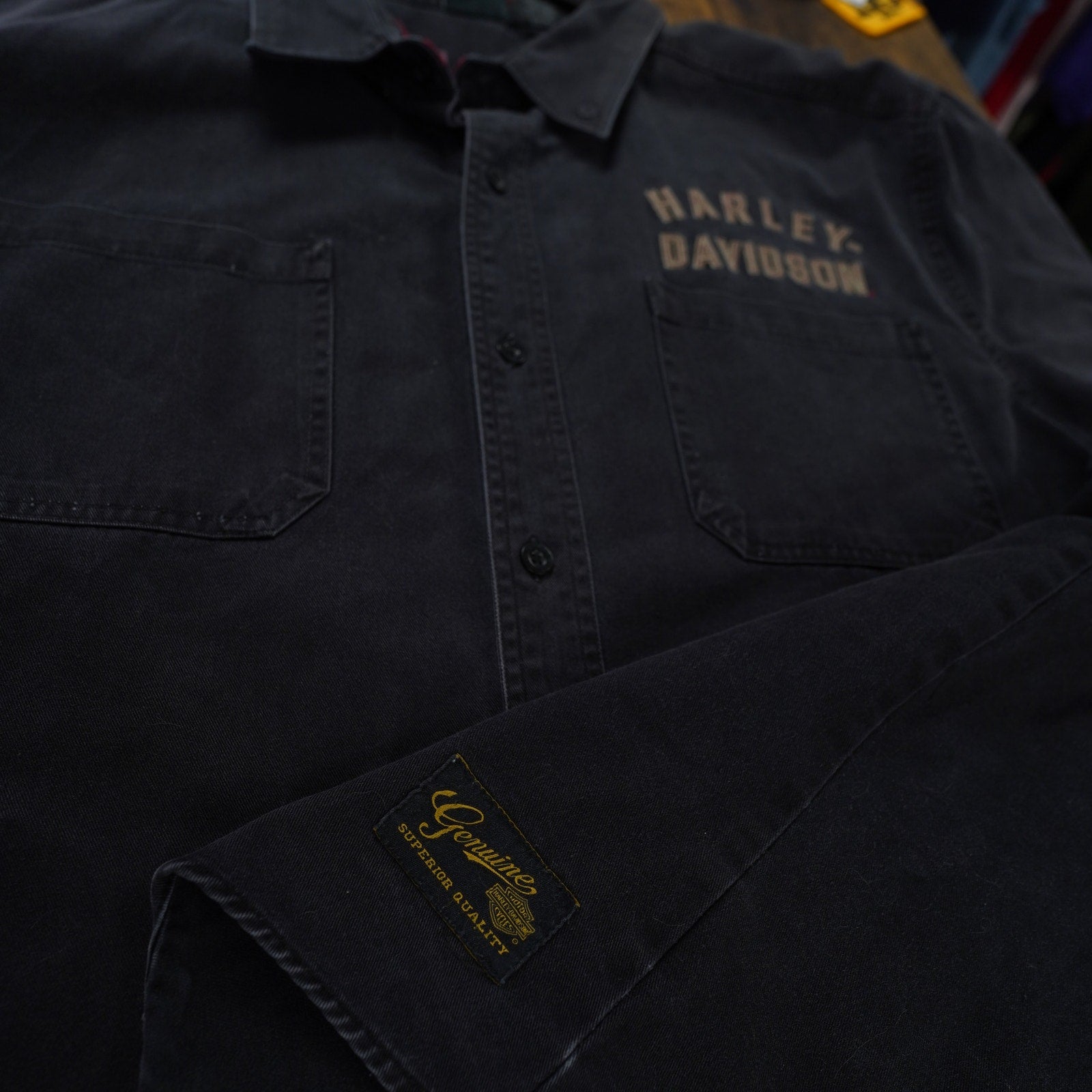 This is a pre-owned vintage Harley Davidson button-down shirt. It features intricate stitching and a classic eagle design on the back.