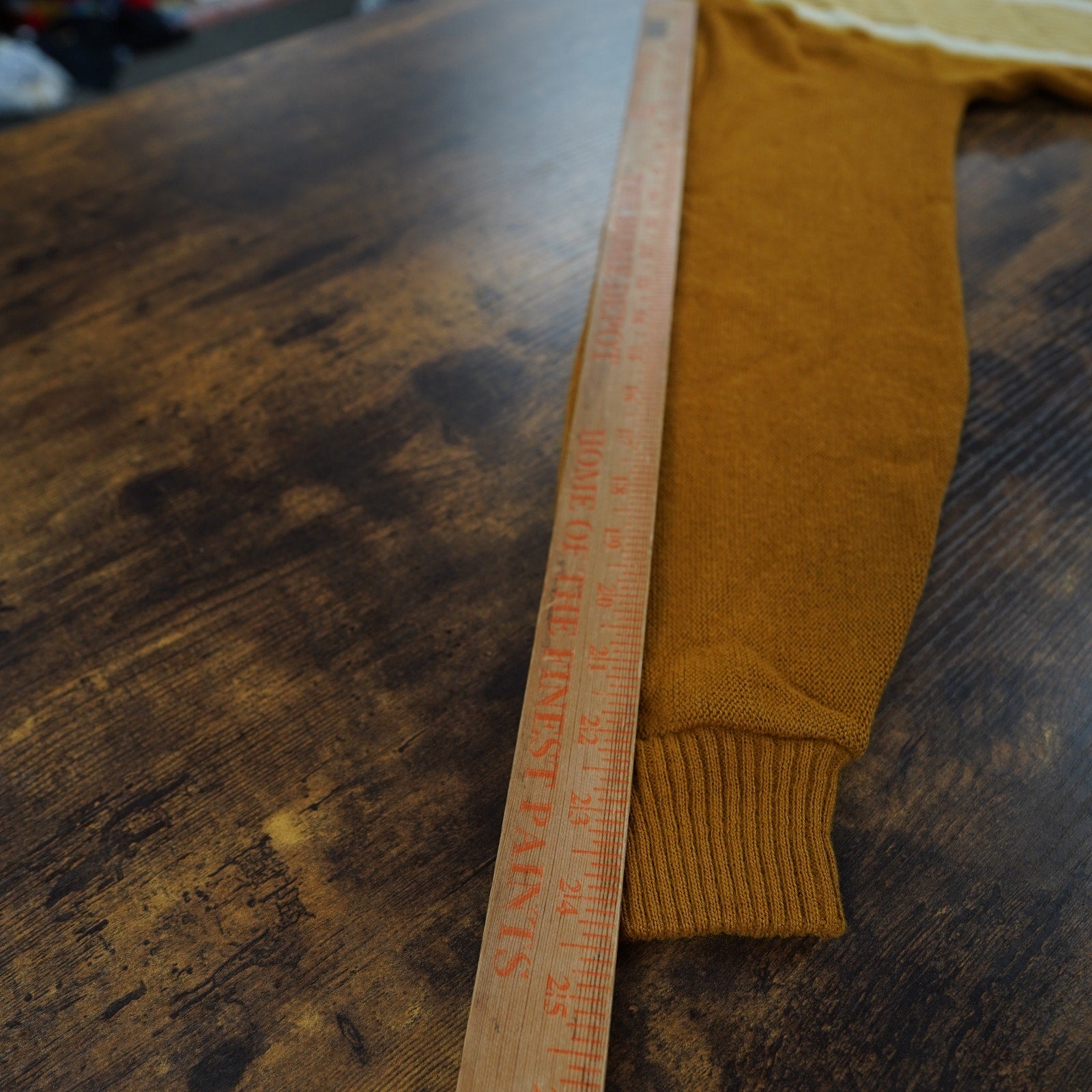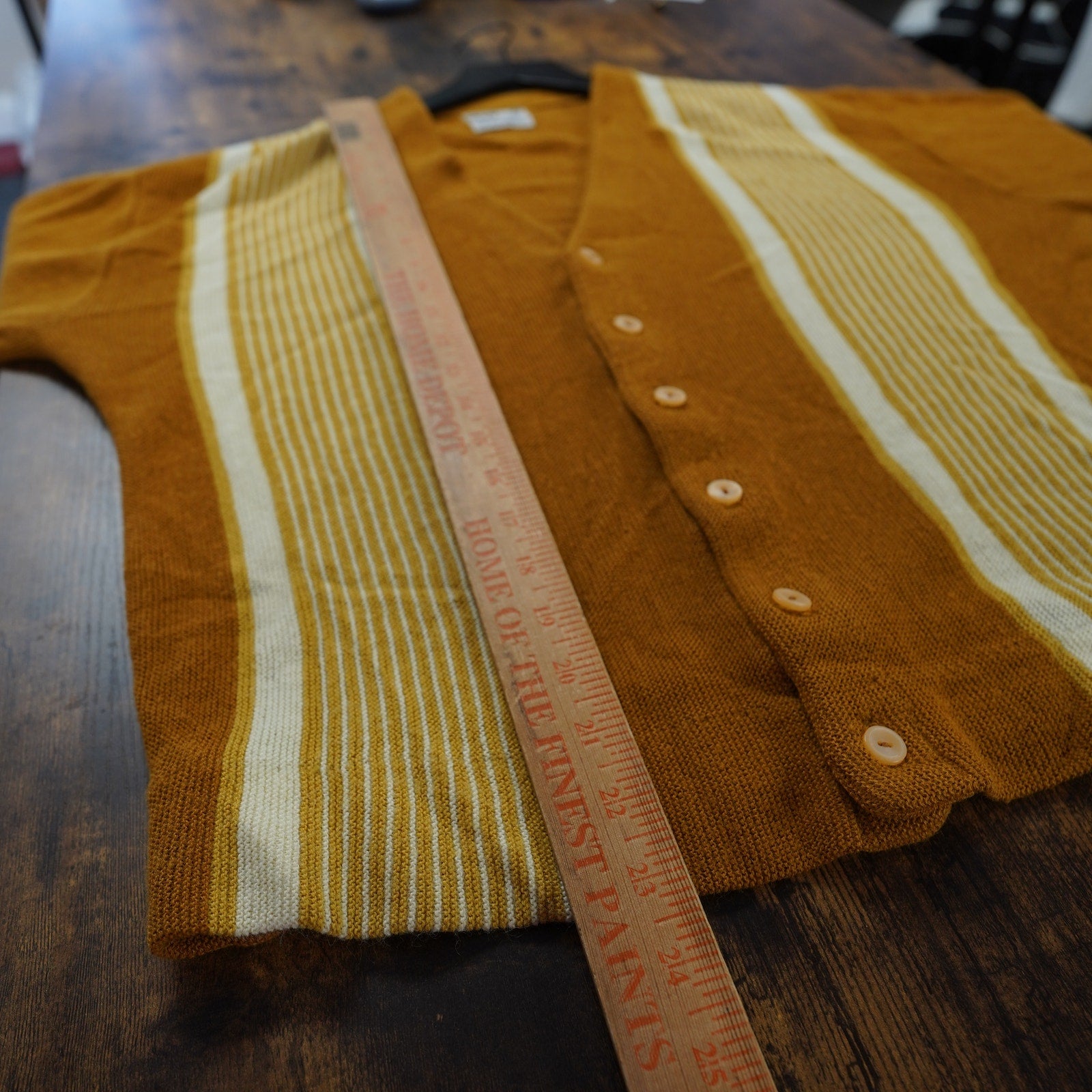 Step back in time with this true vintage Sears Sportswear cardigan from the 1960s-70s! This eye-catching yellow knit sweater features classic stripes and is a great way to add a retro touch to your wardrobe. Perfect for layering or making a statement on its own, this men's size L cardigan is a unique find for any vintage enthusiast. Grab this cozy piece of history before it's gone!