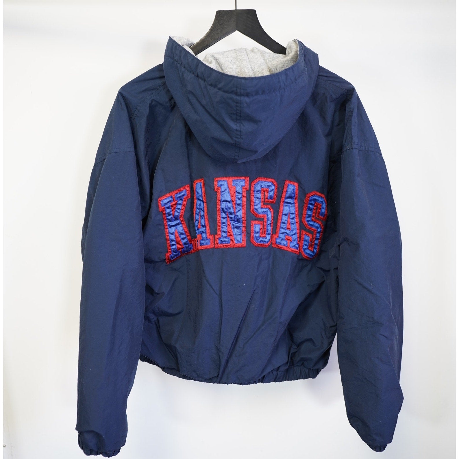 The high-quality embroidered Jayhawks logo on the front shows off your team pride with flair. Whether you're heading to a game, out for a casual stroll, or just want to add a touch of retro athletic wear to your wardrobe, this windbreaker is an absolute winner.
