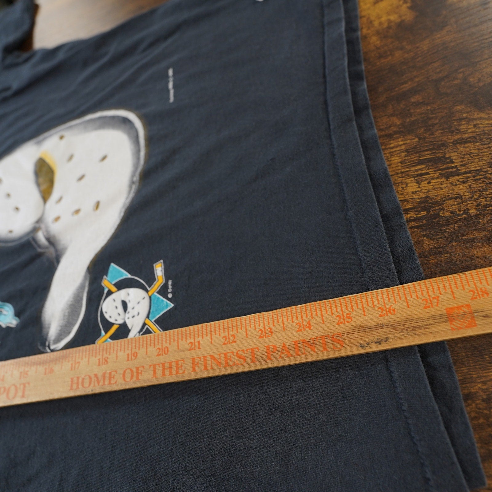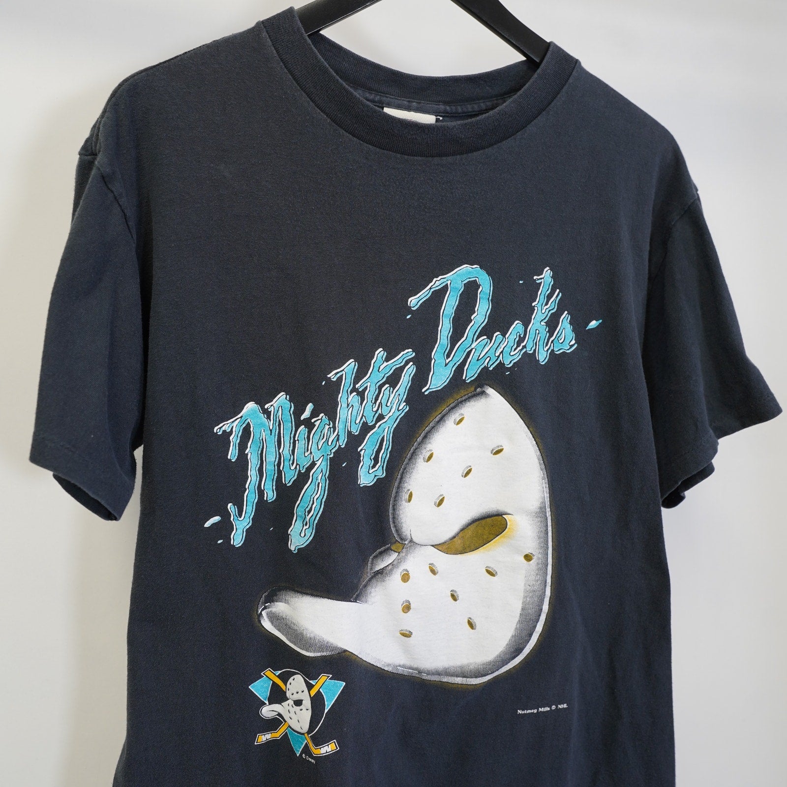 Step back in time with this fantastic vintage 90s Mighty Ducks NHL T-Shirt by Nutmeg Mills! This iconic black single-stitch tee is a true gem for any hockey fan or vintage clothing enthusiast.