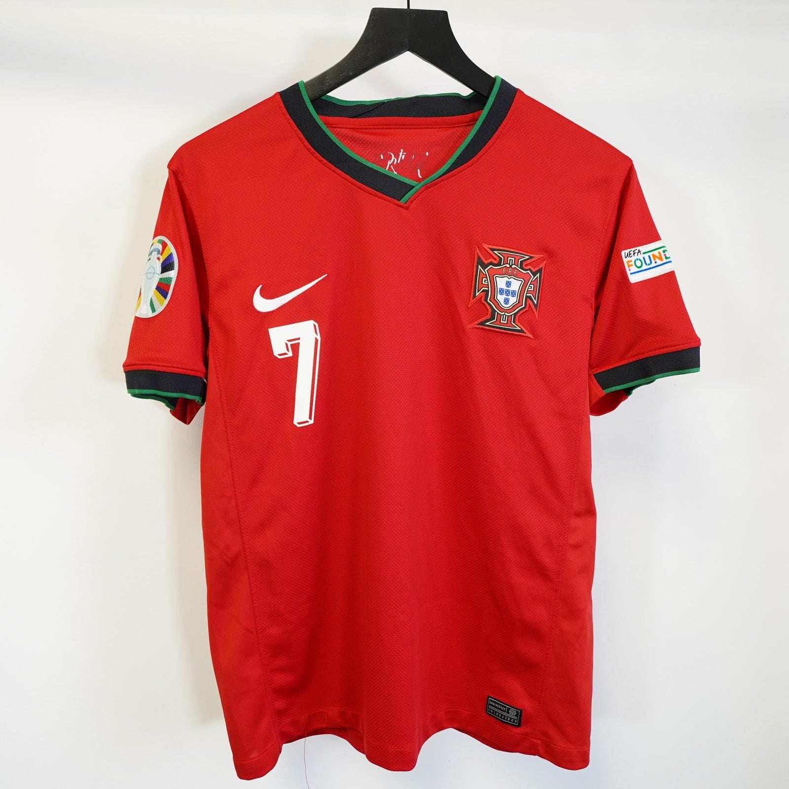 Get ready to cheer on your favorite team with this fantastic Cristiano Ronaldo Nike Portugal Soccer Jersey! This men's size medium jersey is a must-have for any football enthusiast or dedicated Ronaldo fan. Show your support for Portugal in style, whether you're at the stadium, watching a match with friends, or just showcasing your passion for the beautiful game.Crafted by Nike from high-quality polyester, this vibrant red jersey is designed for comfort and performance, making it perfect for everyday wear or game day excitement. It celebrates the spirit of the Euros and the iconic career of Cristiano Ronaldo. This pre-owned jersey is in excellent condition, ready for its next proud owner. It's a superb piece for collectors and fans alike. Don't miss out on owning a piece of football history!