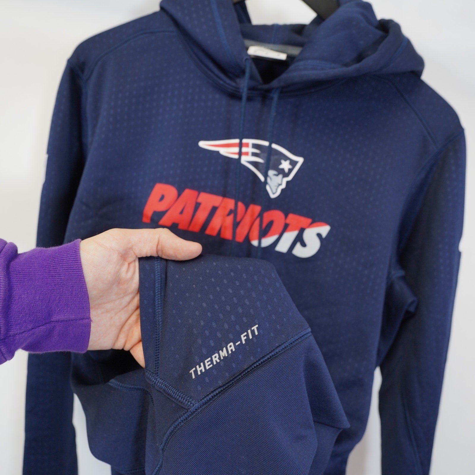 This cozy and comfortable hoodie is perfect for any New England Patriots fan. Crafted with Nike's innovative Therma-Fit technology, it's designed to help keep you warm and insulated, making it ideal for those cooler game days or casual everyday wear. The classic navy blue color proudly displays your team spirit, and the iconic Patriots logo lets everyone know where your loyalty lies.