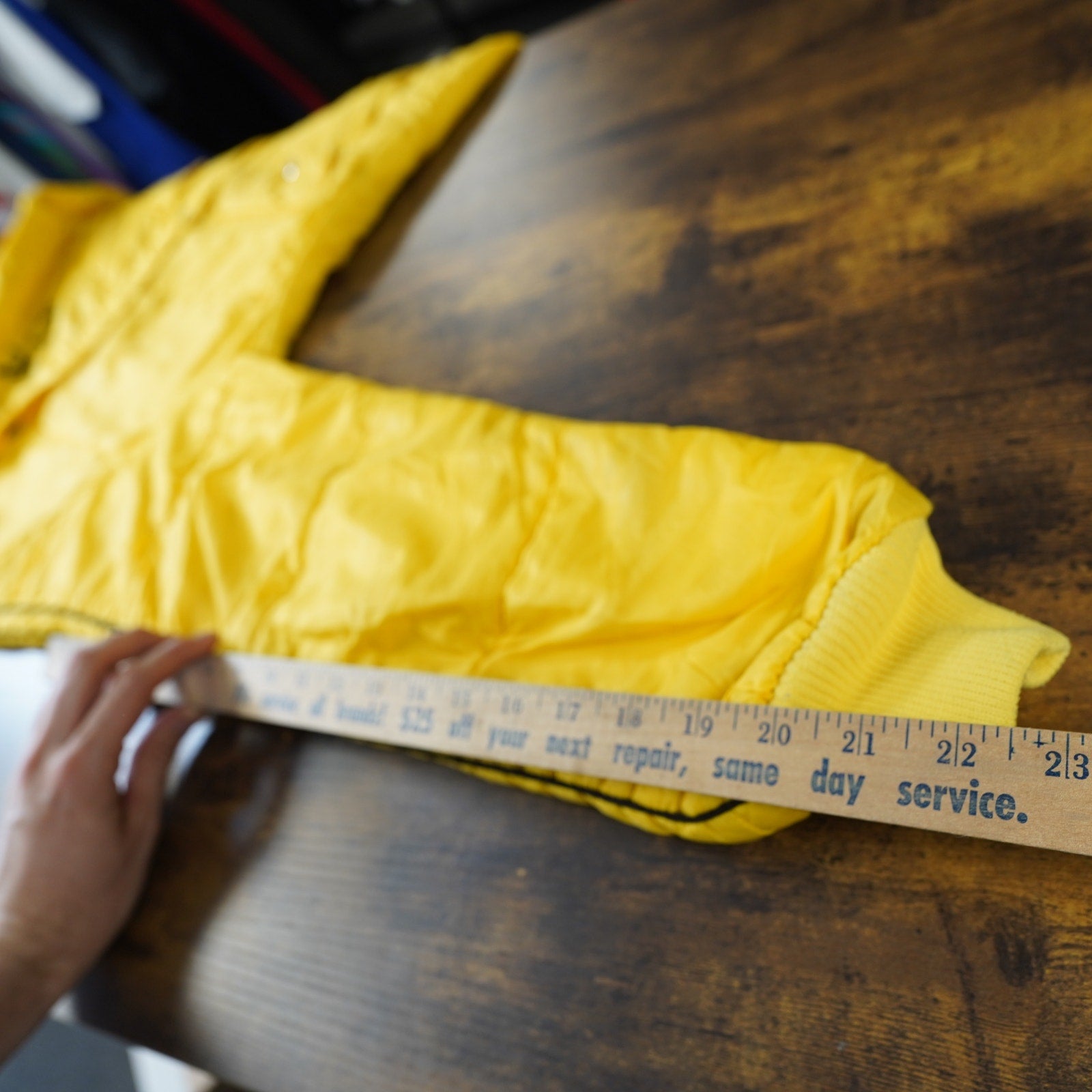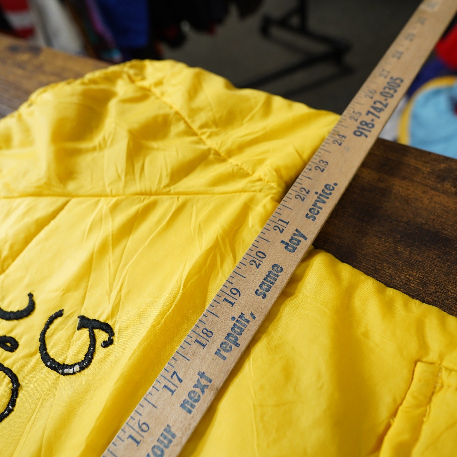 Step back in time with this fantastic true vintage 1970s Swingster Western Puffer Jacket! This iconic piece captures the unique style of the era, perfect for anyone who loves retro fashion or wants to make a statement. The vibrant yellow color and distinctive chain-stitched details truly set it apart.