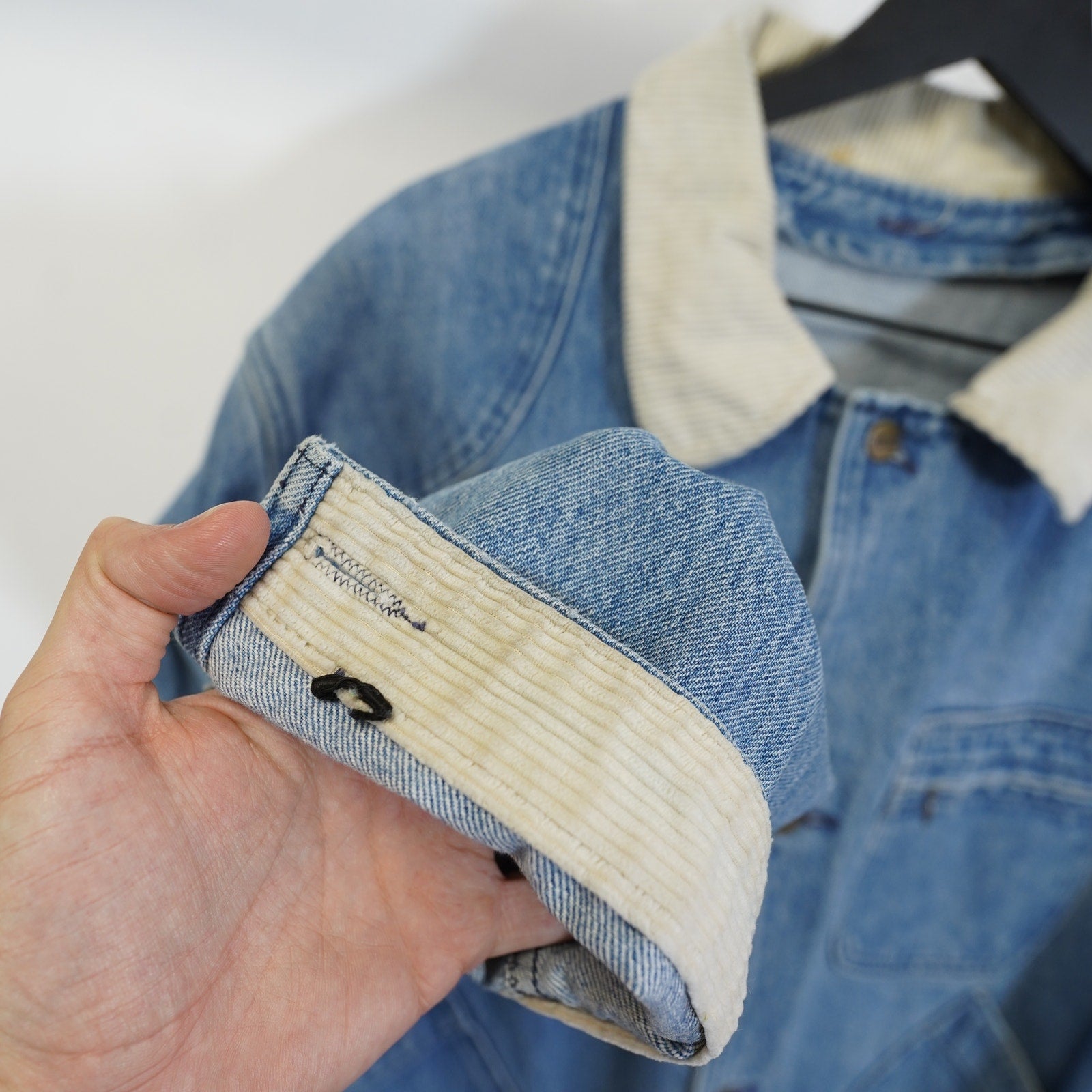 This can fit an XL or XXL refer to measurements. There is some light yellowing on the corduroy sleeve cuffs.