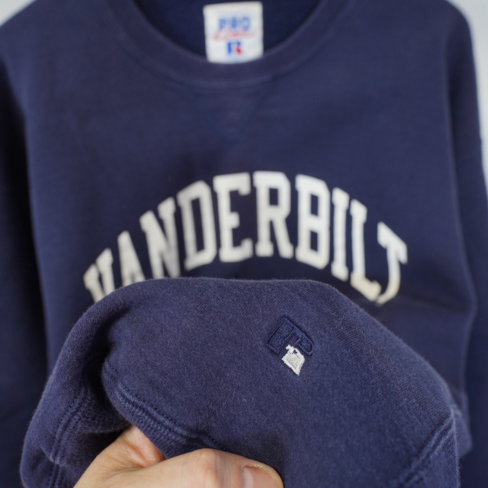 Get your hands on this awesome vintage Russell Athletic Vanderbilt sweatshirt! This navy blue sweatshirt is a true gem from the 90s, perfect for any fan or vintage clothing enthusiast.