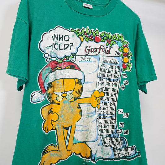 (XL) Vintage Santa Garfield Christmas T-Shirt Men's XL Single Stitch Green Holiday
